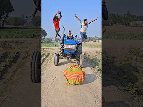 Jumping in front of the tractor in a lungi.