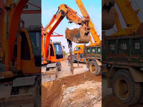 Bác tài xế đứng trên thùng xe ben chỉ cho máy xúc đổ đất! #excavator