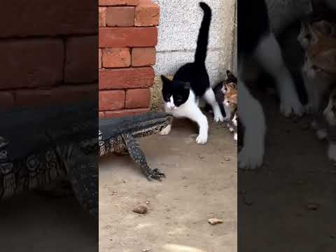 Tiny Cat Takes On Massive Lizard to Save Her Babies #courage #wildlife #cats