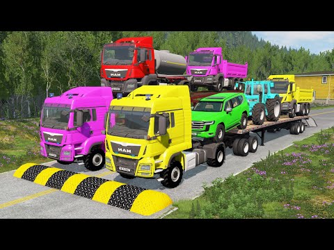 Flatbed Trailer Cars Transportation with Truck - Speedbumps vs Cars vs Train - BeamNG.Drive #011