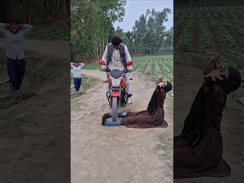 A beggar woman in disguise stands on the street in disguise to steal a motorcycle.