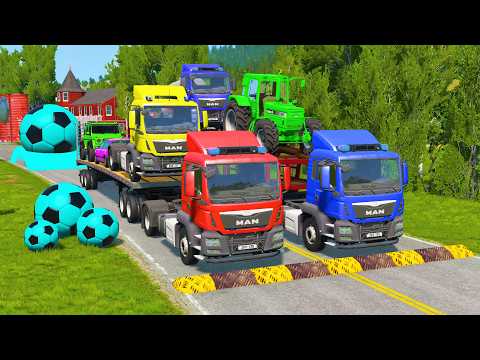 Flatbed Trailer McQueen Transportation with Truck - Speedbumps vs Cars vs Train - BeamNG.Drive #4