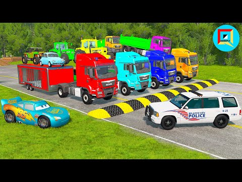 Quadruple Trucks Transporting cars with Flatbed Trailers | Cars vs Speedbump vs Train vs Pothole #94